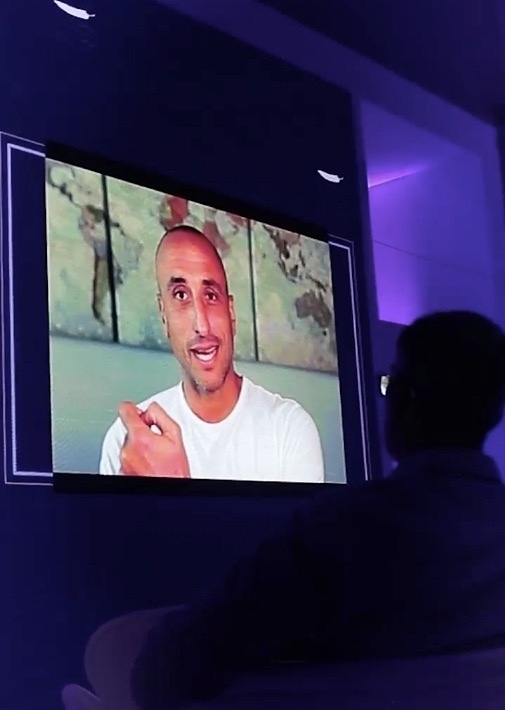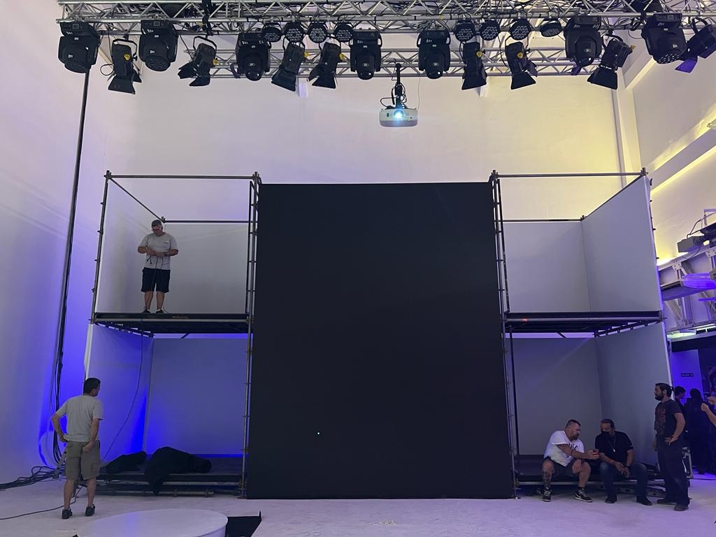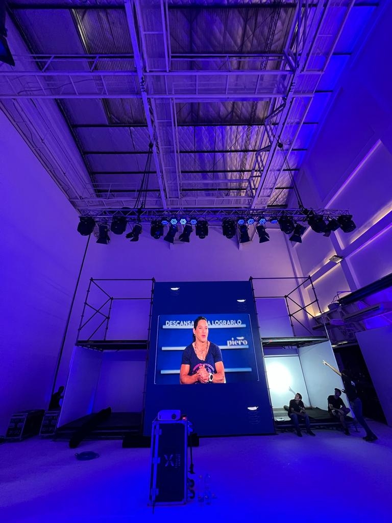 MIX de evento presencial + Streaming con montaje de estudio en doble altura con revestimiento completo de pantallas led trabajando en conjunto a nuestra parrilla de luces operable a 12 mts de la superficie y pasillo de recibimiento KINETIC.