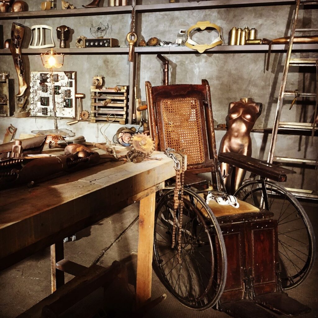 Objetos de utilería realizados por BUBBLESTUDIOS que formaron parte de la escenografía de estética Steampunk del Workshop de Gaby Herbstein realizado en Mayo del 2016.